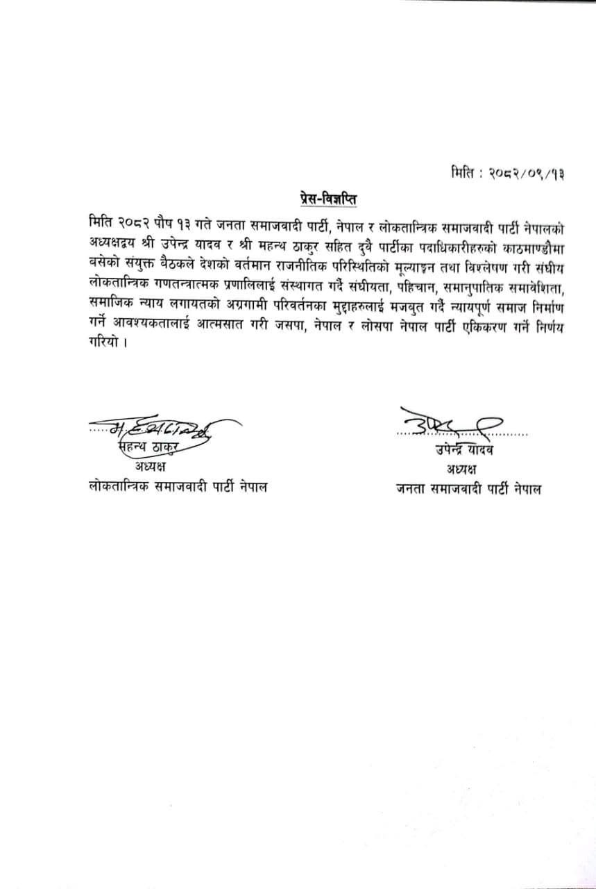 प्रेस विज्ञप्तिमा लोसपा नेपालका अध्यक्ष महन्थ ठाकुर र जसपा नेपालका अध्यक्ष उपेन्द्र यादवको हस्ताक्षर रहेको छ।