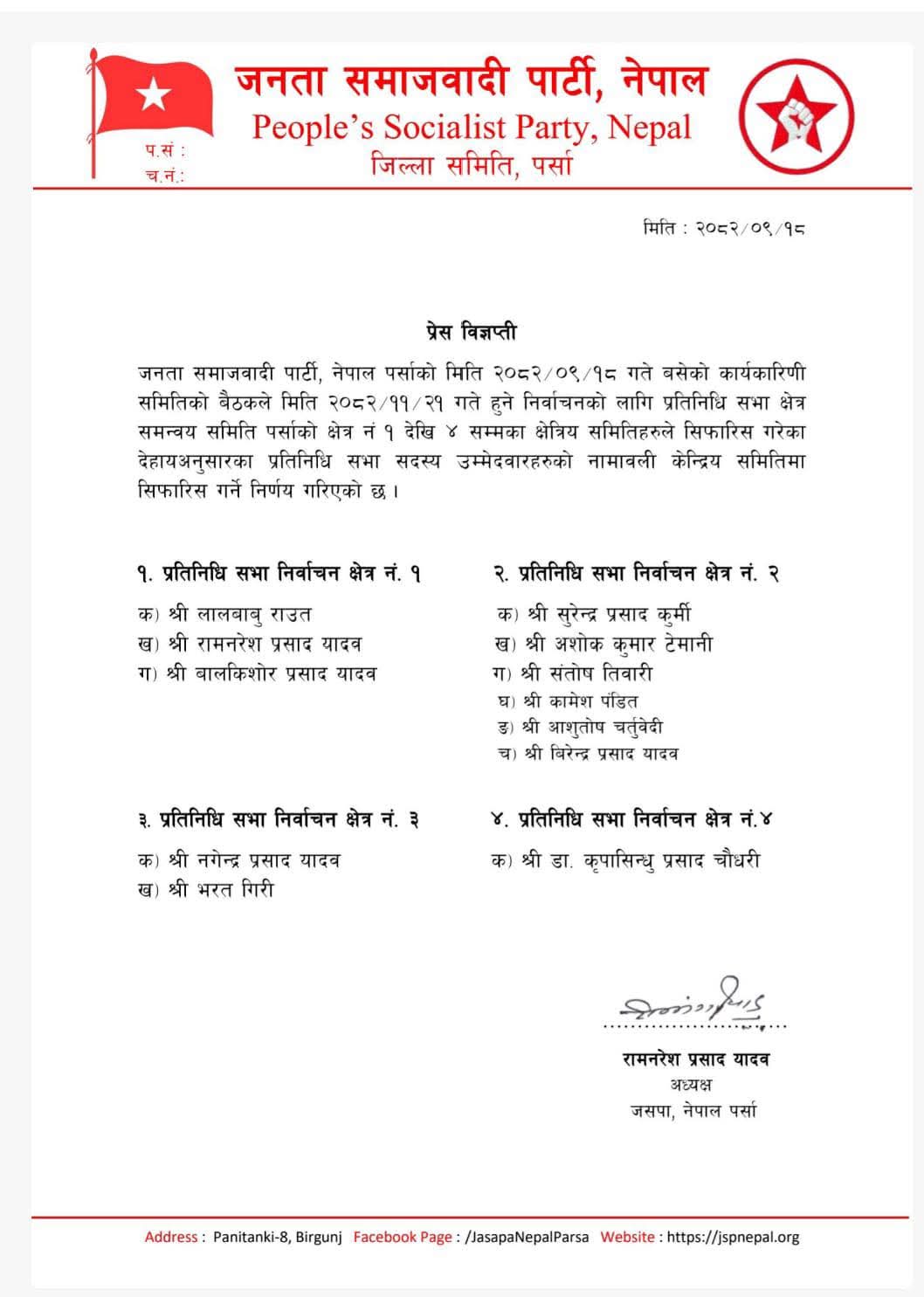पार्टीको पर्सा जिल्ला कार्यकारिणी समितिको शुक्रबार बसेको बैठकले आगामी प्रतिनिधि सभा निर्वाचनका लागि प्रत्यक्ष तर्फका उम्मेदवारहरू सिफारिस गरेको हो ।