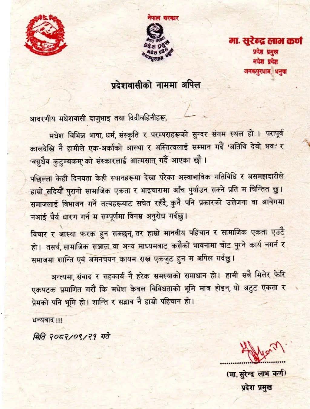 प्रदेशवासीको नाममा सोमबार अपिल जारी गर्दै यस्तो आग्रह गरेका हुन् । मधेश विविध भाषा, धर्म, संस्कृति र परम्पराको सुन्दर संगम स्थल भएको उल्लेख गर्दै उनले सदियौंदेखि आपसी सहअस्तित्व, ‘अतिथि देवो भवः’ र ‘वसुधैव कुटुम्बकम्’ को मूल्य–मान्यतालाई आत्मसात गरेको बताए ।