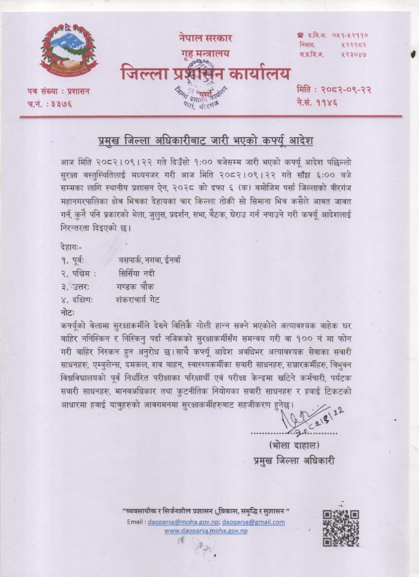 जिल्ला प्रशासन कार्यालय पर्साले कर्फ्यु आदेश उल्लङ्घन गर्ने जो–कोहीमाथि कडा कारबाही गरिने चेतावनी दिएको छ।