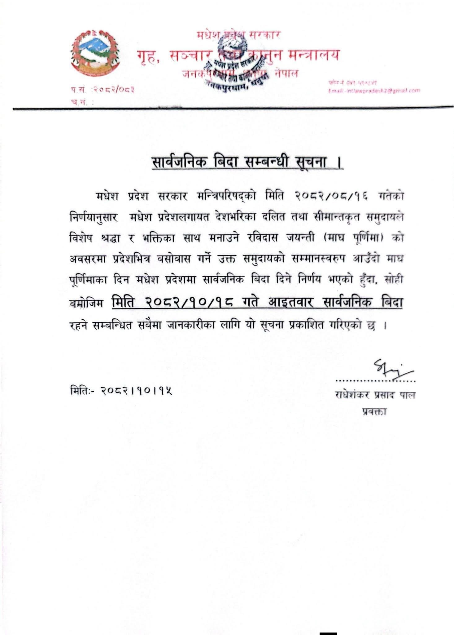 गृह, सञ्चार तथा कानून मन्त्रालयले सूचना जारी गर्दै यसबारे बताएको हो । मधेस प्रदेश मन्त्रिपरिषद्को मंसिर १६ गतेको निर्णय अनुसार मधेस लगायत देशभरका दलित तथा सीमान्तकृत समुदायले विशेष श्रद्धा र भक्तिका साथ मनाउने रविदास जयन्तीको अवसरमा प्रदेशभित्र बसोबास गर्ने उक्त समुदायको सम्मानस्वरूप सार्वजनिक बिदा दिने निर्णय गरिएको हो ।