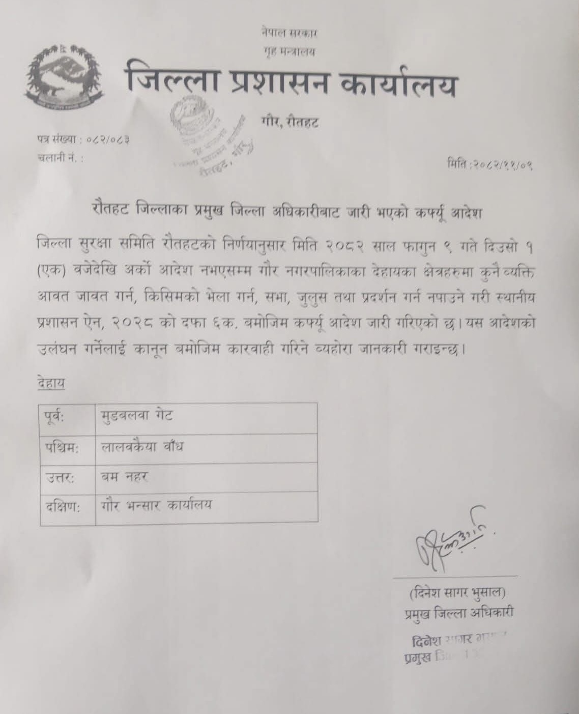 पूर्वमा मुडवलवा गेट, पश्चिमतर्फ ललवैया बाँध, उत्तरमा बम नहर र दक्षिणतर्फ गौर भन्सार कार्यालय गेटसम्मको क्षेत्रलाई कर्फ्यु आदेशको दायरामा राखिएको प्रशासनले जनाएको छ।