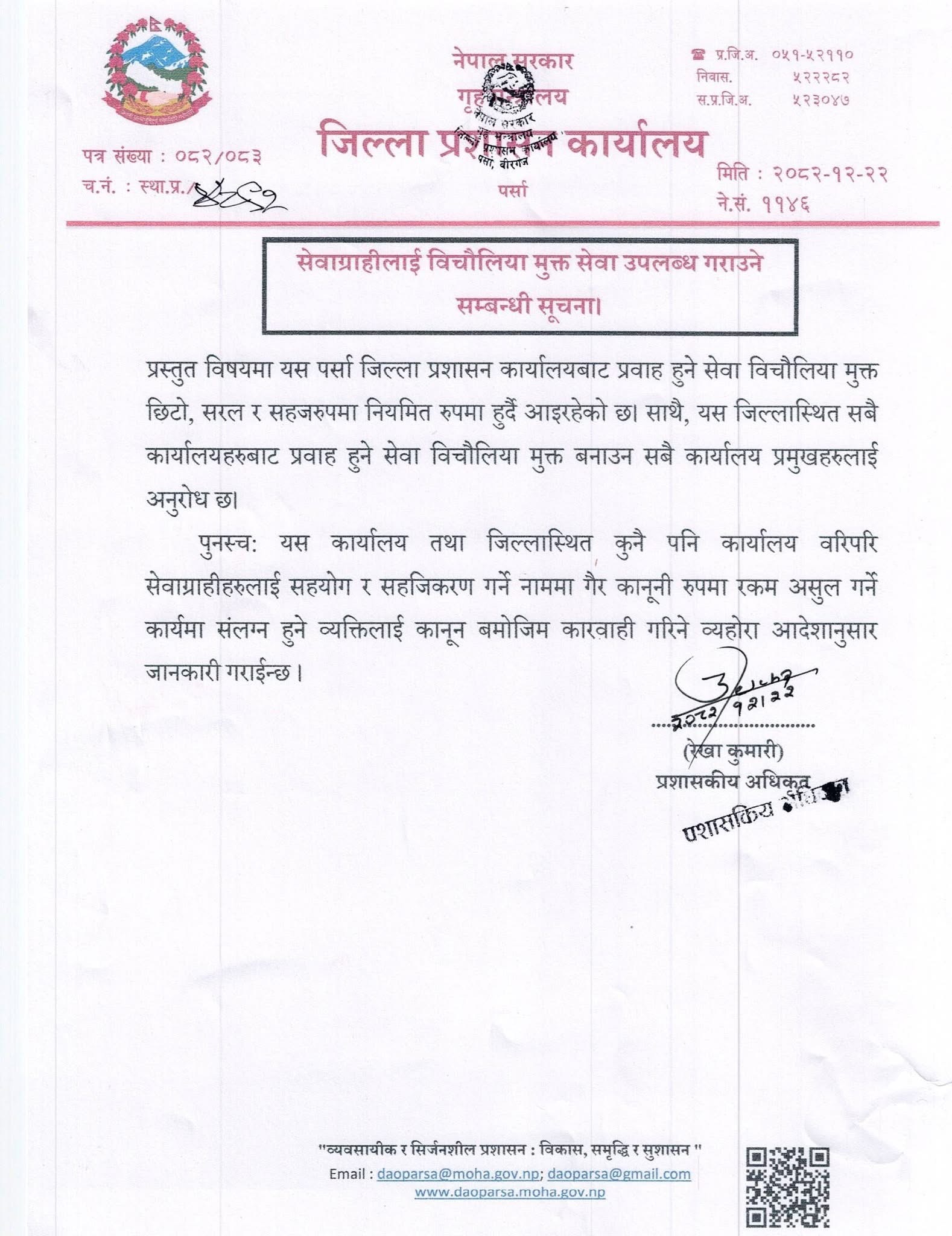 वीरगन्ज । जिल्ला प्रशासन कार्यालय पर्साले सरकारी अड्डाहरुलाइ बिचौलिया मुक्त सेवा दिन निर्देशन दिएको छ ।