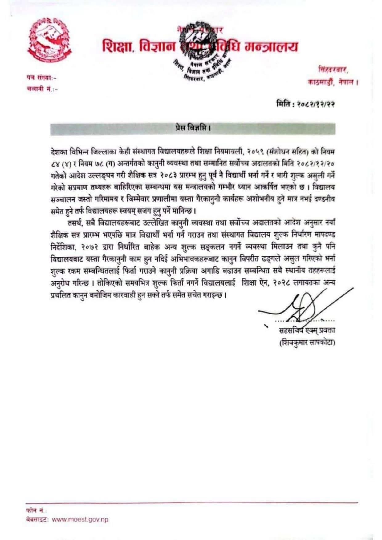 मन्त्रालयले शिक्षा नियमावली, २०५९ (संशोधन सहित) तथा सर्वोच्च अदालतको आदेश विपरीत शैक्षिक सत्र सुरु हुनु अघि नै भर्ना लिने र विभिन्न शीर्षकमा अतिरिक्त शुल्क उठाउने कार्यप्रति गम्भीर ध्यानाकर्षण भएको बताएको छ ।
