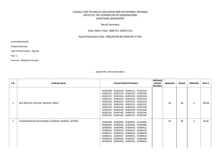 प्रकाशित नतिजा अनुसार बीएचसी मेडिकल कलेजका सबै ४० जना विद्यार्थी सफल भएका छन्, जुन उपलब्धि नयाँ स्थापना भएका कलेजका लागि मात्र नभई समग्र प्राविधिक शिक्षाक्षेत्रकै लागि प्रेरणादायी मानिएको छ ।