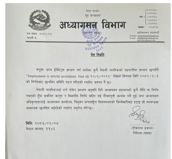 केही नेपाली नागरिकको राहदानीमा प्रस्थान छापसँगै रोजगारी पूर्णतया निषेध गरिएको भन्ने बेहोरा लेखिएको भेटाएपछि विभाग एक्सनमा उत्रिएको हो।