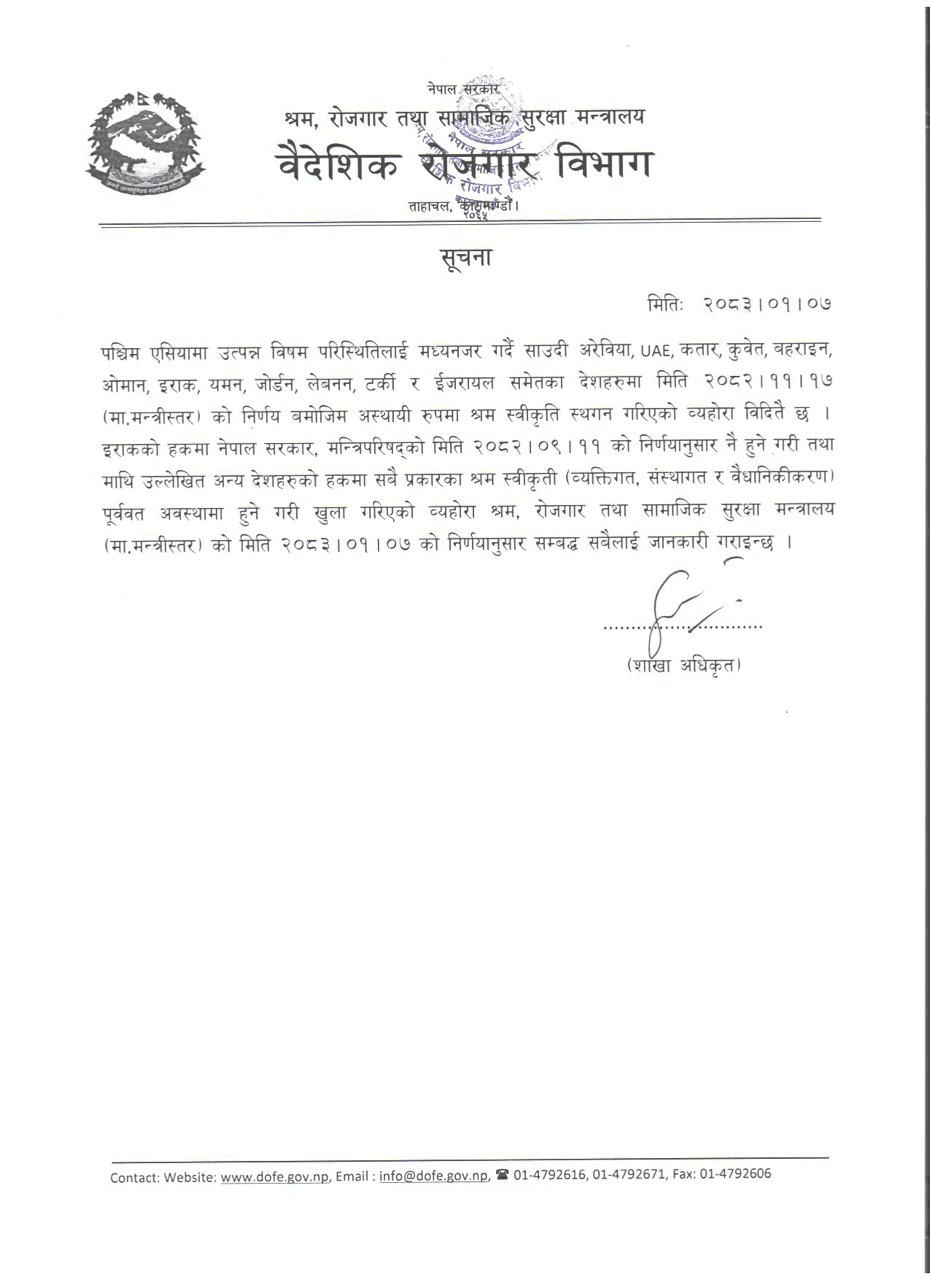 युद्धका कारण खाडी तथा पश्चिम एसियाली देशमा रहेका नेपालीहरूको सुरक्षालाई मध्यनजर गर्दै श्रम मन्त्रालयले गत फागुन १७ गते श्रम स्वीकृति, पुनः श्रम स्वीकृति स्थगन गर्ने निर्णय गरेको थियो ।