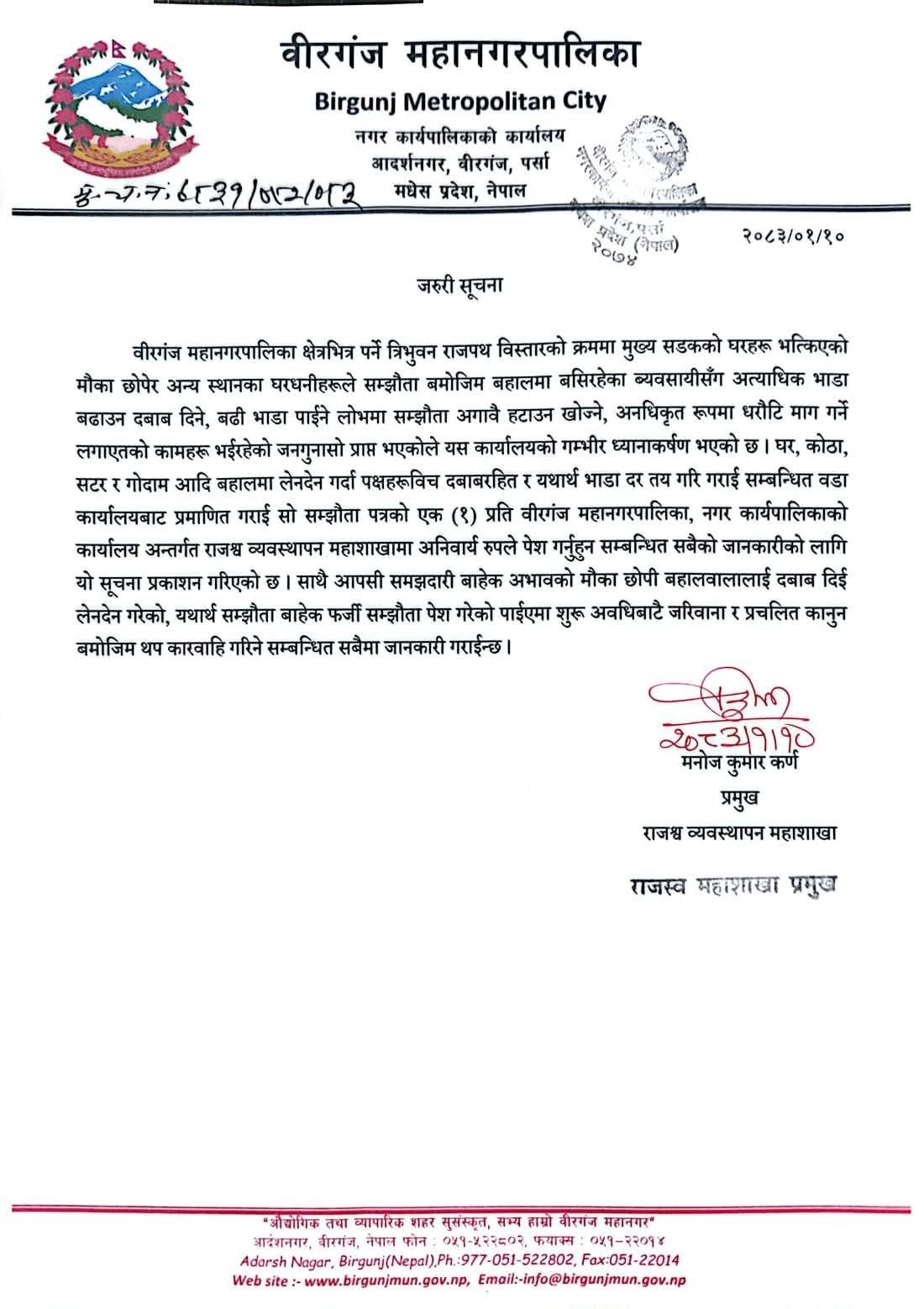 पछिल्लो समय घरधनीहरुले व्यवसायीमाथि अत्यधिक भाडा बढाउन दबाब दिने, बढी भाडा पाउने लोभमा सम्झोता तोड्न खोज्ने र अनाधिकृत रुपमा धरौटी माग गर्ने लगायतका गुनासो प्राप्त भएको राजश्व व्यवस्थापन महाशाखा प्रमुख मनोज कुमार कर्णले जारी विज्ञप्तिमार्फत भनेका छन् ।