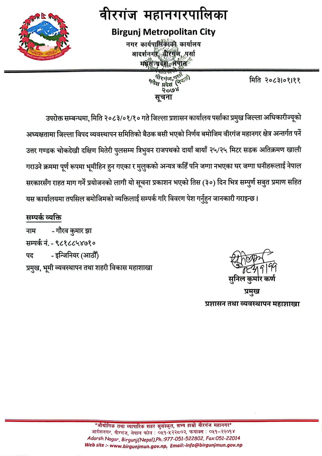 थप जानकारीका लागि महानगरपालिकाको भूमि व्यवस्थापन तथा शहरी विकास महाशाखाका प्रमुख गौरव कुमार झासँग सम्पर्क गर्न आग्रह गरिएको छ ।