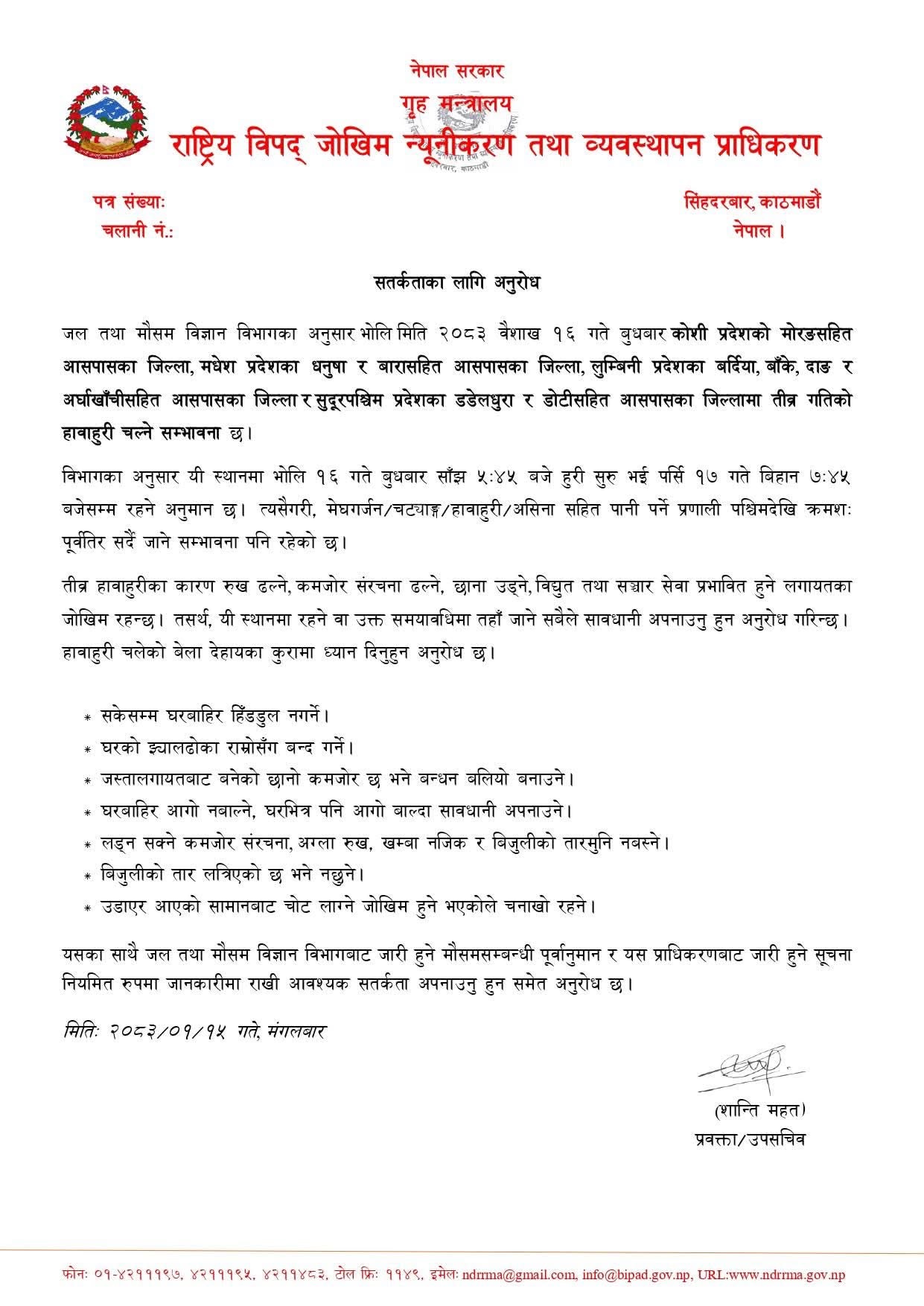 राष्ट्रिय विपद् जोखिम न्यूनीकरण तथा व्यवस्थापन प्राधिकरणले बुधबार साँझदेखि बिहीबार बिहानसम्म मधेशका बारा, धनुषा लगायत आसपासका जिल्लामा तीव्र हावाहुरी चल्न सक्ने भएकाले सावधानी अपनाउन आग्रह गरेको हो ।