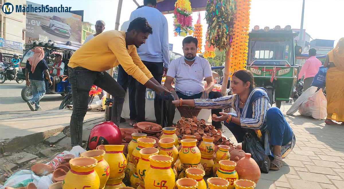 वीरगन्ज बजारमा माटाका सामग्री राखेर बिक्री गर्ने उनीहरू कहाँ यसपटक अघिल्ला वर्षका तिहारमा झैं भीडभाड छैन ।