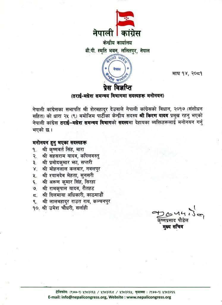 नेपाली कांग्रेसको विधान २०१७ (संशोधनसहित) को धारा २५ (९) को बमोजिम कांग्रेस केन्द्रिय सदस्य किरण यादव प्रमुख रहेकी तराइ–मधेस समन्वय विभागमा सदस्यहरु मनोनयन गरिएको जनाइएको छ ।