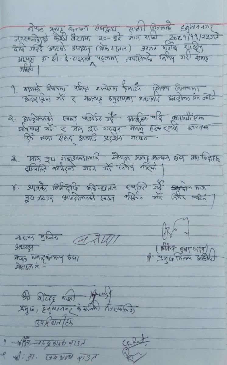 समझदारीपत्रमा संघका अध्यक्ष नारायण मुखिया र जिल्ला प्रशासन कार्यालय, सप्तरीका सहायक प्रमुख जिल्ला अधिकारी जीतेन्द्र कुमार यादवले हस्ताक्षर गरेका छन्।
